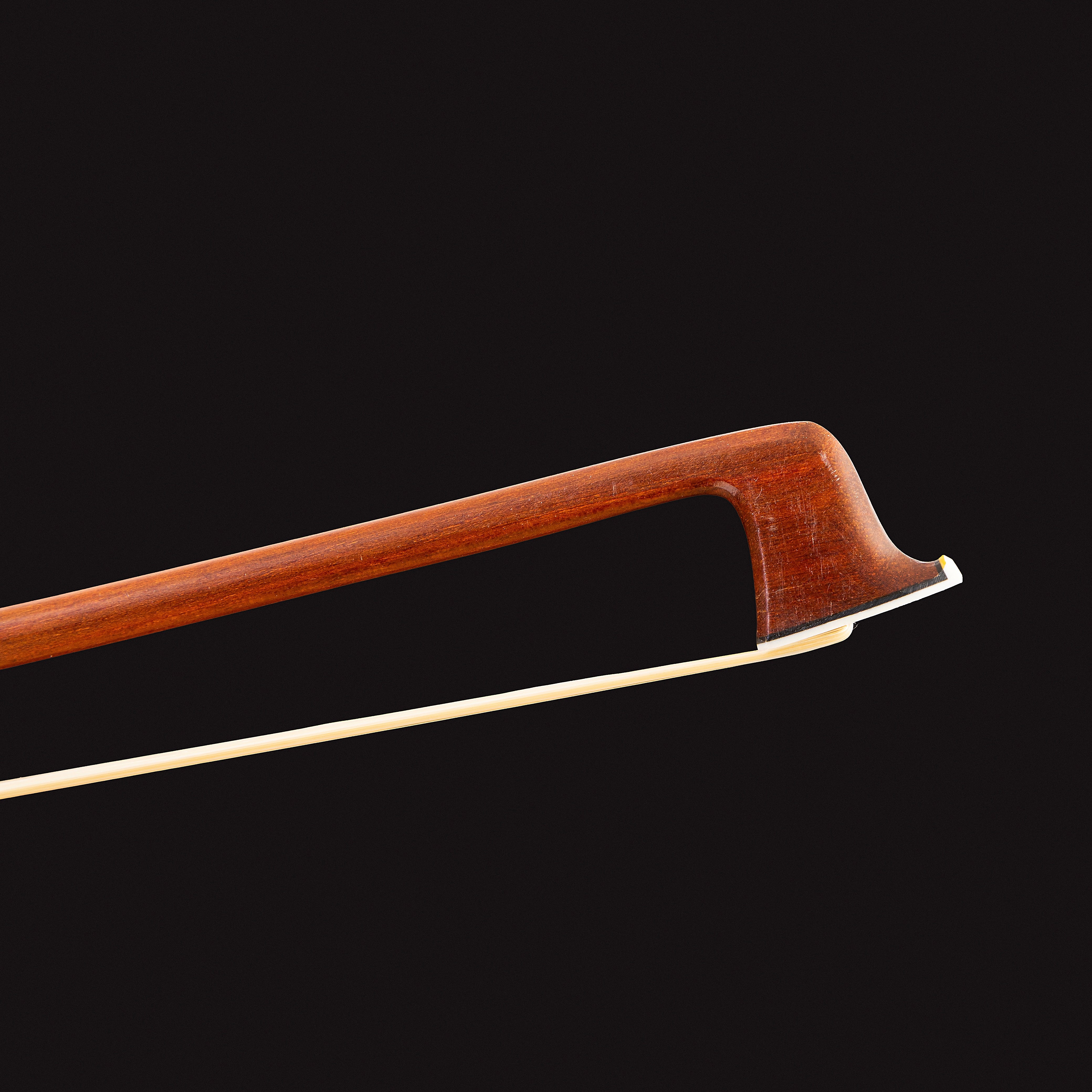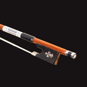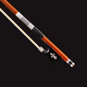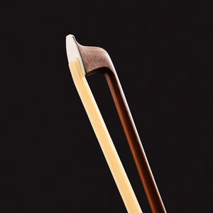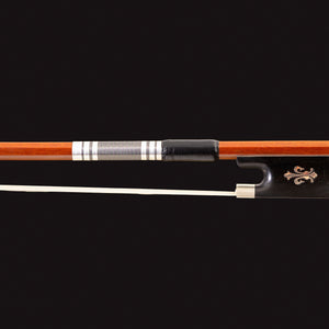 Seu design é realçado por uma guarnição prateada com detalhes em preto e um cushion em couro de ovelha, componentes que garantem um toque macio e uma empunhadura confortável durante a execução. Para uma transmissão sonora de alta fidelidade, o arco utiliza crina de cavalo 100% natural, assegurando uma aderência perfeita às cordas. O acabamento é selado por um botão em níquel prateado com detalhes em ébano e ponta em madrepérola.