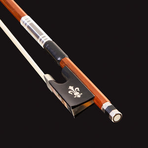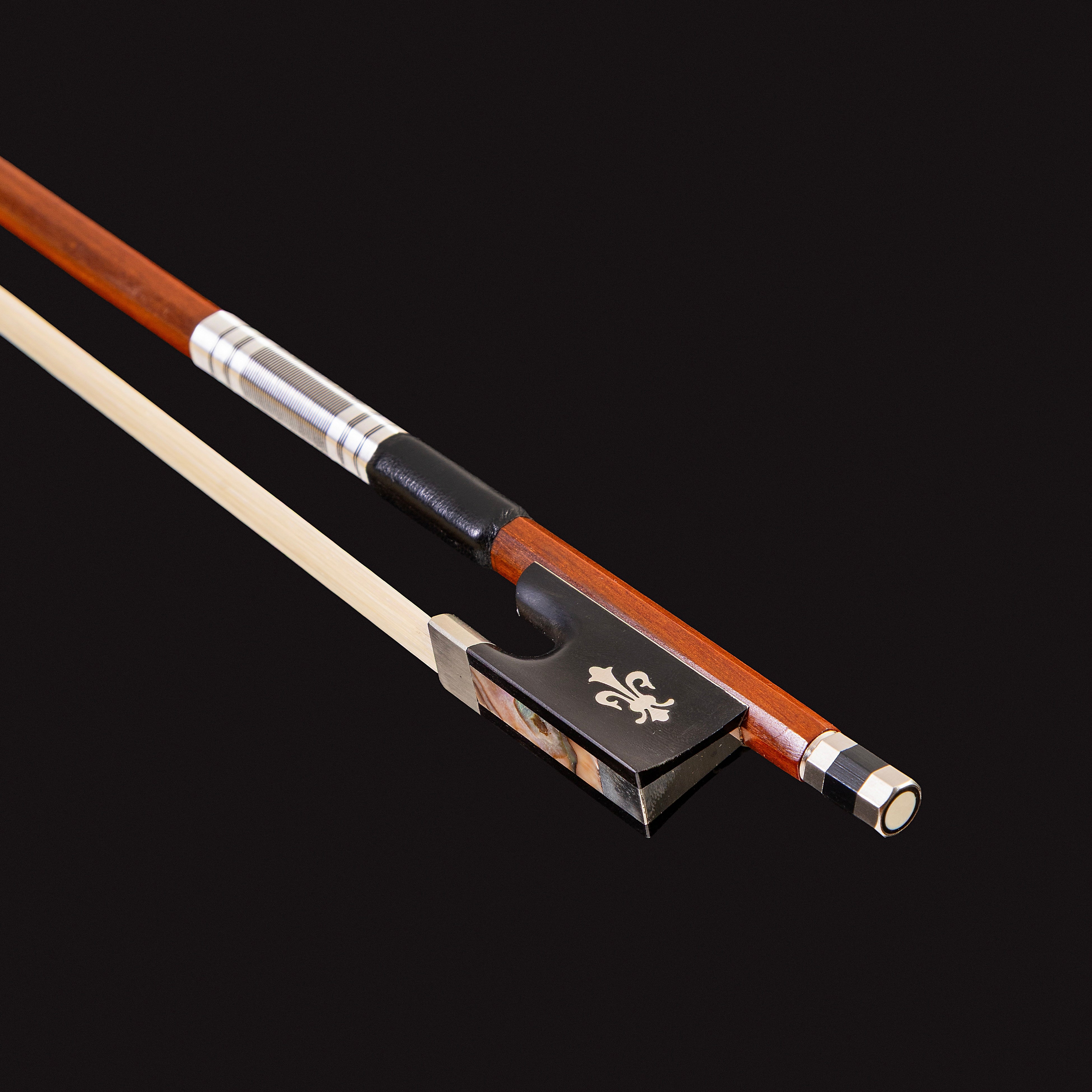 O refinamento deste modelo destaca-se em sua montagem em níquel, que sustenta um talão em ébano, madeira nobre amplamente valorizada por sua densidade e resistência ao uso contínuo. A ornamentação do talão é enriquecida com um fundo em concha do mar e detalhe a icônica Fleur de lys (Flor de Lis), conferindo ao arco uma identidade visual sofisticada e uma elegância clássica.