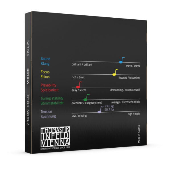 A Thomastik é sinônimo de qualidade mundial, e as Vision Solo VIS100 garantem estabilidade de afinação e durabilidade para performances exigentes. Na Casa dos Violinos, usamos essas cordas originais em todos os modelos, incluindo os artesanais do Luthier Fernando Fagundes, recomendadas para quem busca sonoridade refinada em solos ou grupos de câmara.